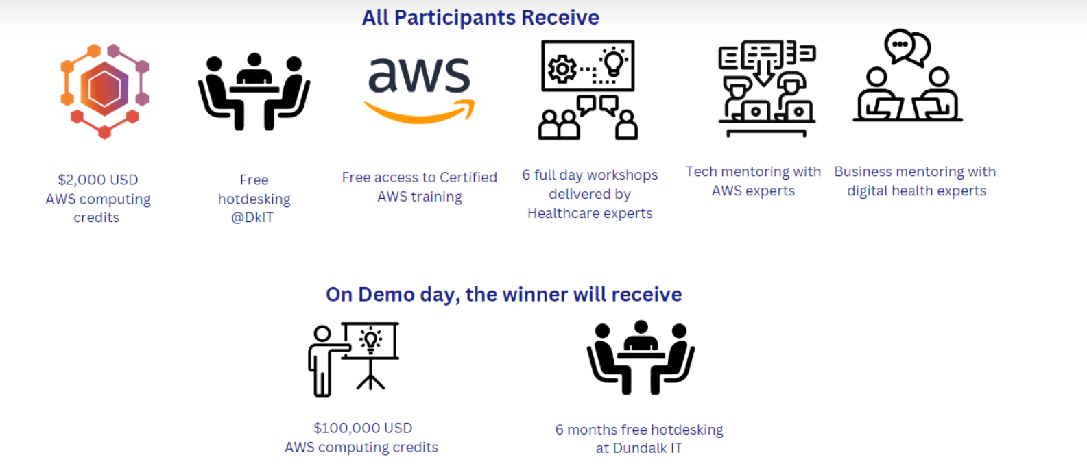 - $2,000 of AWS credits for all participating companies with a Demo Day prize of $100,000 of AWS credits.